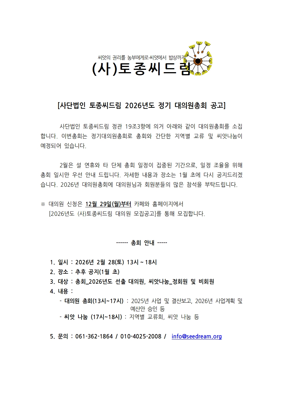 사단법인 토종씨드림 2026년도 정기 대의원총회 공고