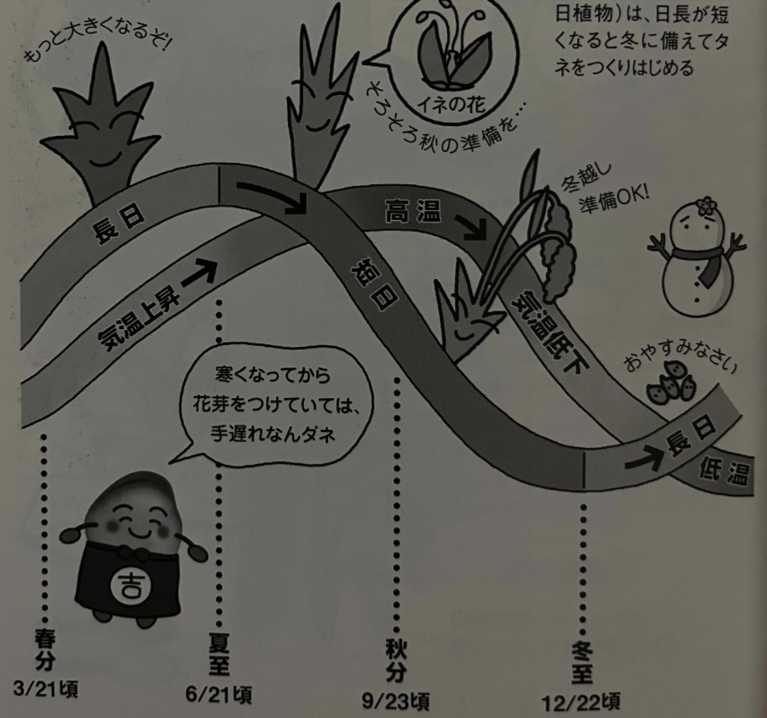 가혹한 계절의 도래를 알아차리는 수단의 하나가 낮의 길이. 낮 길이의 사계는 기온의 사계의 전조가 되기 때문이다. 추위를 싫어하는 벼(단일식물)는 낮의 길이가 짧아지면 겨울에 대비해 씨앗을 만들기 시작한다.
