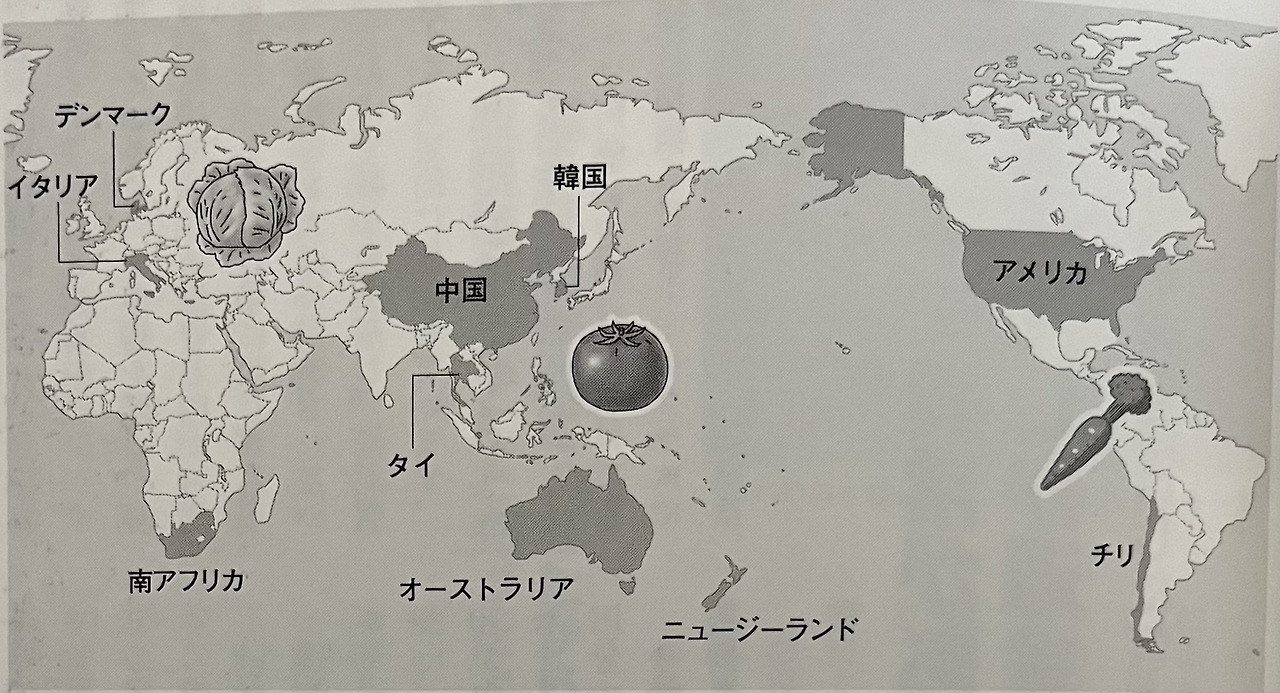 일본이 채소 종자를 수입하고 있는 주요 국가. 경향으로는 유럽은 엽채, 아메리카는 근채, 동남아시아는 과채류가 많다. 재무성에 의하면 품목별 통계는 무만 있어, 1위 한국, 2위 아메리카, 3위 뉴질랜드. 채소가 아닌 곡물로 분류되는데 옥수수는 1위 프랑스, 2위 뉴질랜드, 3위 아메리카(금액 기반).