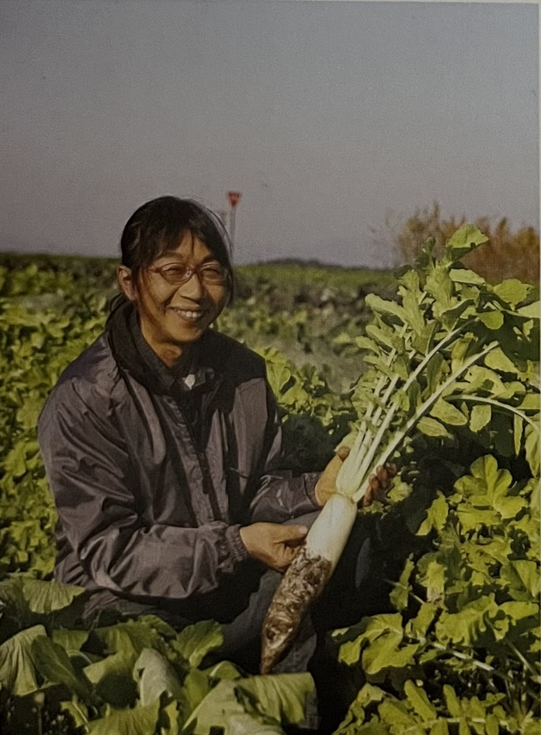 이전 자연농법 국제연구개발센터의 이시와타 카오루 씨. 2015년에 나가노현 마츠모토시에서 신규 취농하여 부인과 둘이서 직접 육종한 토마토나 호박을 재배한다. 농원 이름은 해피 빌리지 팜. 손에 들고 있는 건 오리지날 품종인 '수이진水神 미우라三浦 무'. 절임으로 좋고, 무 조림이나 오뎅으로 좋다. 무를 갈면, 매운맛과 단맛이 절묘하다. 그리고 회의 무채로 해도 맛있다. 일반적인 미우라 무가 수확까지 90일 걸리는데 약 75일이면 수확할 수 있고, 뽑기 쉬운 것도 특징.