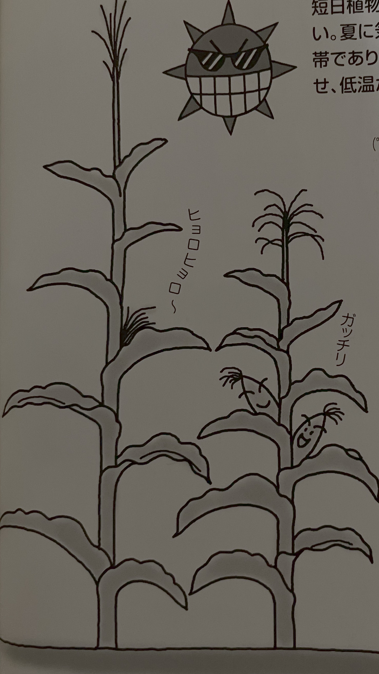 찰옥수수(좌) 큐슈나 시코쿠의 재래종. 낮 길이 변화에 민감한 만생종으로 키가 크다. / 단옥수수(우) 낮 길이 변화에 둔감한 조생으로 키가 작다.