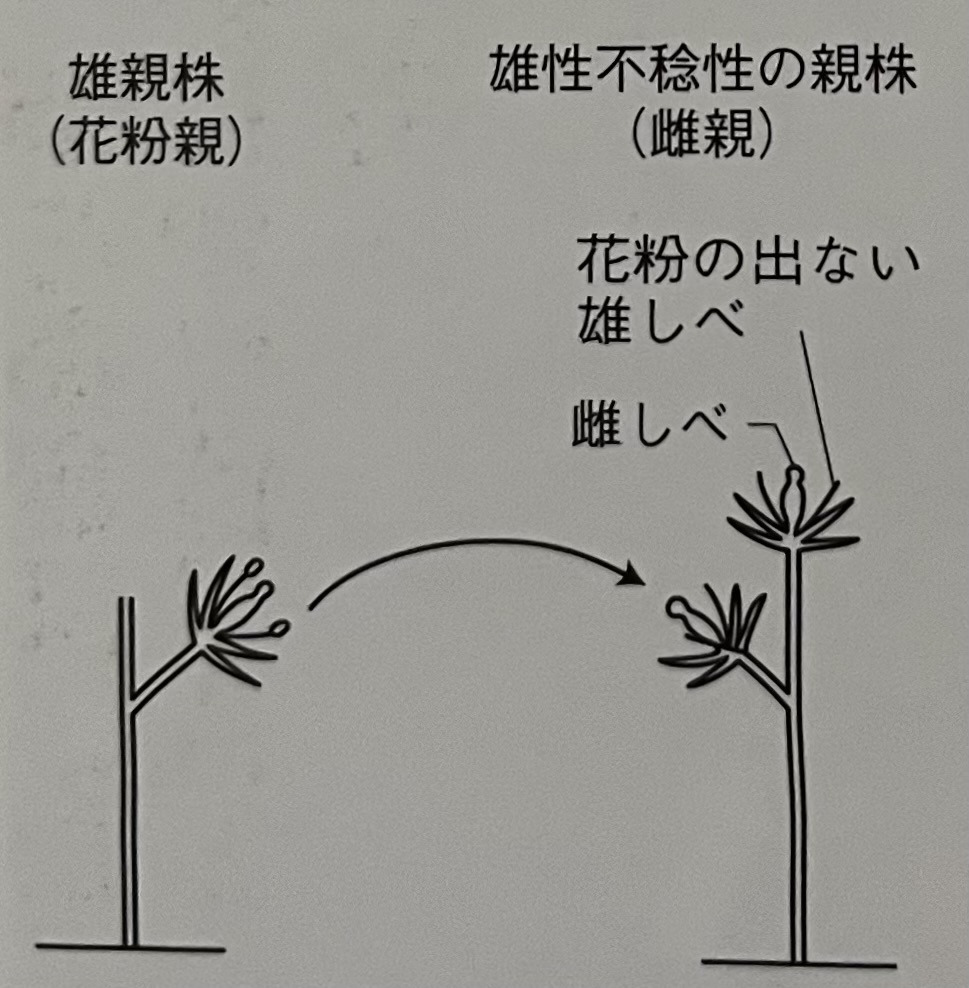 십자화과에서는 가고시마현의 야생 무나 미야기현의 재래종 '코세나小瀬菜 무'라는 무에서 발견된 웅성 불임의 성질(오구라형·코세나형 웅성 불임)이 이용되고 있습니다. 예를 들면 코세나 무(A)를 자친雌親으로, 부모로 하고 싶은 계통 B의 꽃가루를 붙이면, 생긴 자식에게 높은 확률로 웅성 불임 개체가 출현합니다. 그 개체에게 다시 B를 교배시키고(여교잡), 또 여교잡을 몇 세대 계속하면, 웅성 불임성을 가지면서 그 외의 성질은 대부분 B라고 하는 계통 A가 생깁니다. 이 자친 계통 A에 계통 C의 웅친을 붙임으로써 확실하게 F 채종을 할 수 있는 것입니다. 다만, 계통 A는 꽃가루가 생기지 않기에 항상 계통 B를 옆에 조금 심어 씨앗을 유지해야 합니다.