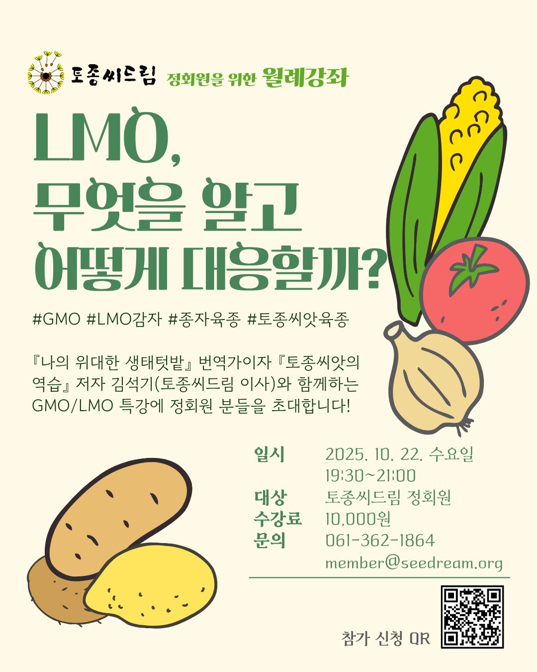 토종씨드림은 본 강좌를 통해 회원들이 LMO(Living Modified Organism, 유전자변형생물체)에 대해 정확히 이해하고 더 나아가 유전자변형생물체 및 종자 육종에 관한 이해와 생태적 이해를 바탕으로 GMO와 토종씨앗의 관계를 체계적으로 다루는 시간이 되길 바랍니다.