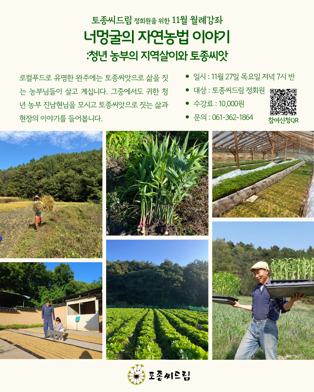 로컬푸드로 유명한 완주에는 토종씨앗으로 삶을 짓는 농부님들이 살고 계십니다. 전통적인 토종 씨앗을 보존하고 증식하며, 이를 이용해 농사를 짓는 농부들의 모임인 '(영농조합)씨앗받는 농부'부터 '완주 토종씨드림' 지회까지 활발한 활동을 펼치고 계시는데요. 이번 월례강좌에서는 완주의 농부님들 중 한 분인 진남현 청년농부를 모시고 현장의 이야기를 들어볼 예정입니다. 귀농부터 자연농법과 토종씨앗 그리고 자립까지 좌충우돌하며 씩씩하게 나아가는 이야기 들으러 오실래요?