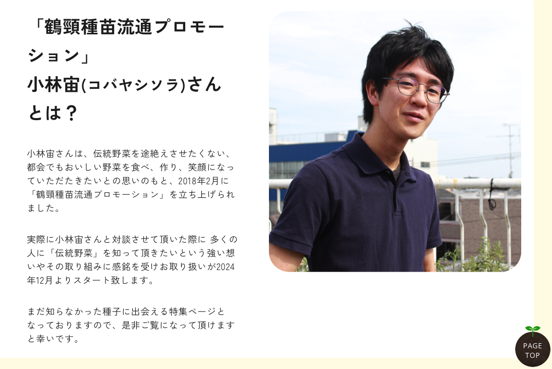 "코바야시 히로시 씨는 전통 채소가 사라지지 않게 하며, 도심에서도 맛있는 채소를 먹고 재배하며 웃음이 피어나길 바라는 마음으로 2018년 2월 ‘카쿠케이 종묘 유통 프로모션’을 시작했습니다.