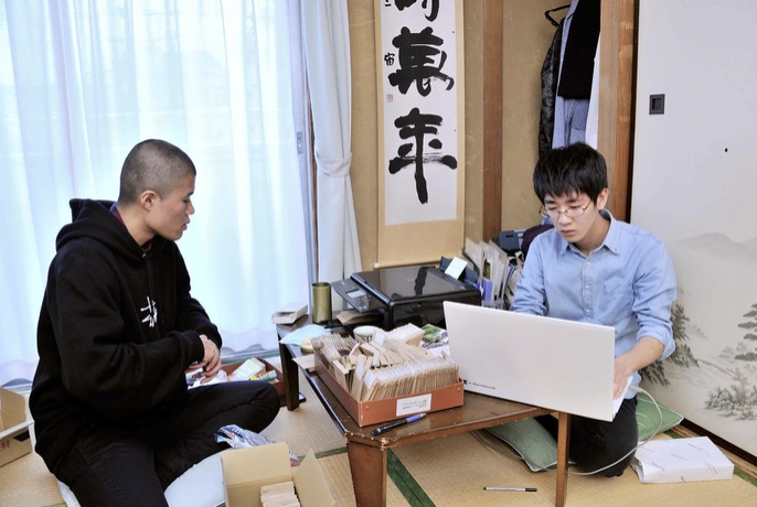 일은 주로 주말에 한다. 사진 왼쪽은 부 활동 친구인 아베 준야阿部純也 씨(촬영: 우메타니 히데지)