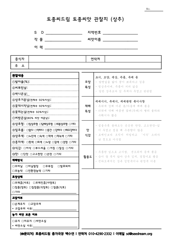 정성껏 작성하여 보내주신 관찰지는 토종씨앗의 가치를 보존하고 토종씨앗 기록 정보를 널리 공유하는 소중한 자료로 쓰입니다.